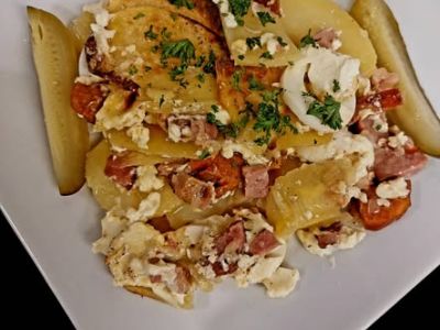 Grilované sýrové hranolky, opečený brambor, tatarská omáčka