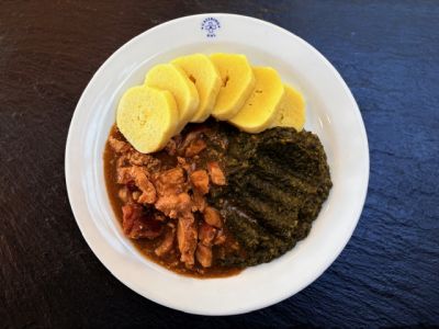 150g Vepřová plec po selsku s česnekovým špenátem a bramborovým knedlíkem 17310