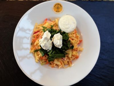 • NÍZKOSACHARIDOVÁ MISKA - kuřecí maso marinované v jogurtu s římským kmínem, kurkumou a zázvorem, salát z řepy s jogurtem, paprika, květáková rýže s kurkumou, pečené batáty, jogurtový dip s chilli/VEGE VARIANTA SE SÝREM HALLOUMI