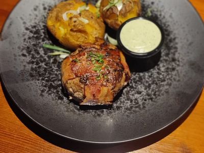 150g STEAK Z VEPŘOVÉ KRKOVICE brambory Grenaille a omáčka z pečené cibulky, slaniny a smetany