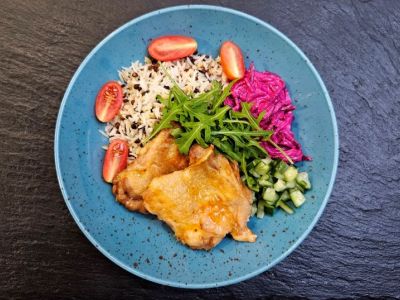 Buddha bowl s kuřecím masem, rýží, avokádem a arašídovou omáčkou