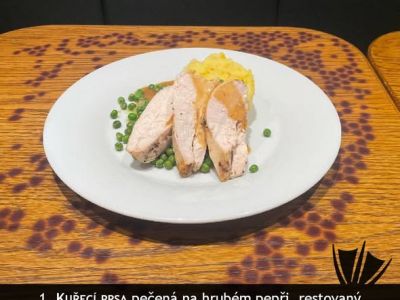 150 g BBQ kuřecí steak zapečený s čedarem, bramborové dukátky 7