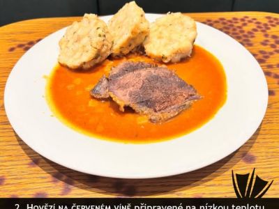 150g Hovězí maso ve svíčkové omáčce, brusinkový citrón se šlehačkou, houskový knedlík 1, 3, 7