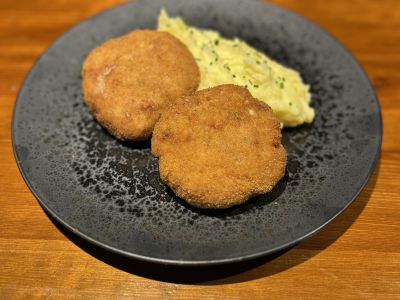 Smažený masový karbanátek s bramborovou kaší, okurka 1356781011