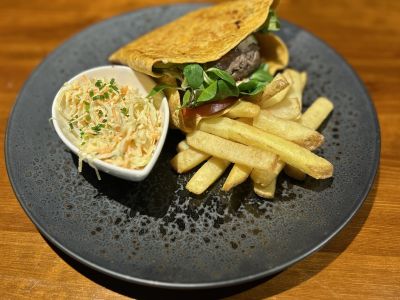 150 g Fajitas Wrap- tortilla plněná vepřovým masem, paprikou, cibulí, fajitas koření, bramborové dukátky 13.7
