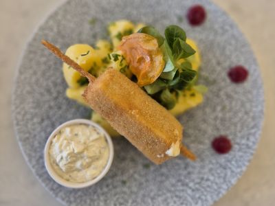 LOŠTICKÝ kuřecí řízek plněný syrečky, bramborová kaše, okurkový salátek
