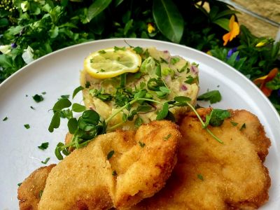Smažený kuřecí/vepřový řízek, šťouchané brambory