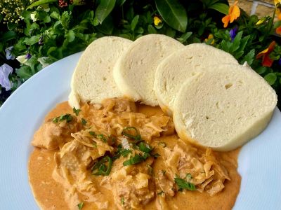 Zvěřinový guláš s kynutým knedlíkem, cibule