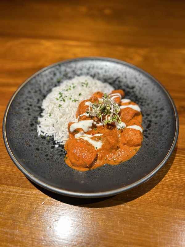 170g BUTTER CHICKEN - kousky z kuřecích prsou v mírně pikantní rajčatová omáčce s kešu ořechy, máslem, smetanou, římským kmínem, koriandrem a kari; A/...