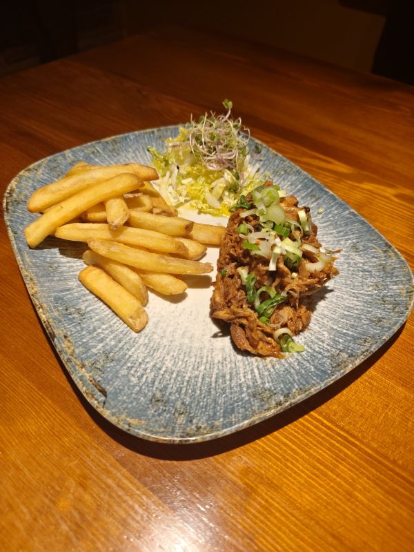 150g Naše BBQ TRHANÉ vepřové maso s česnekovým dipem nebo pikantní Jalapeňo majonézou; A/ pečené batáty nebo B/ smažené steakové hranolky