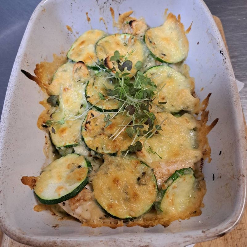 120g Grilované kuřecí proužky, zapečená cuketa s tymiánem, česnekem a sýrem (