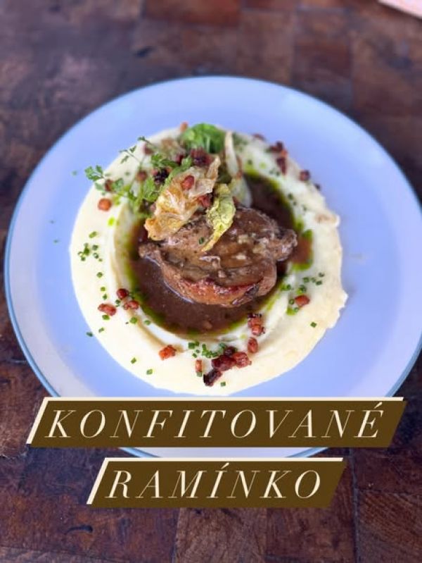 Konfitované vepřové ramínko, bramborová kaše, slaninový crumble, restovaná kapusta