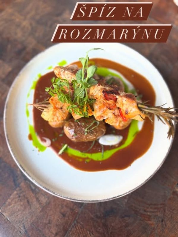 Kuřecí špíz s paprikou na rozmarýnu, pečené grenaille, bylinkový demi glace