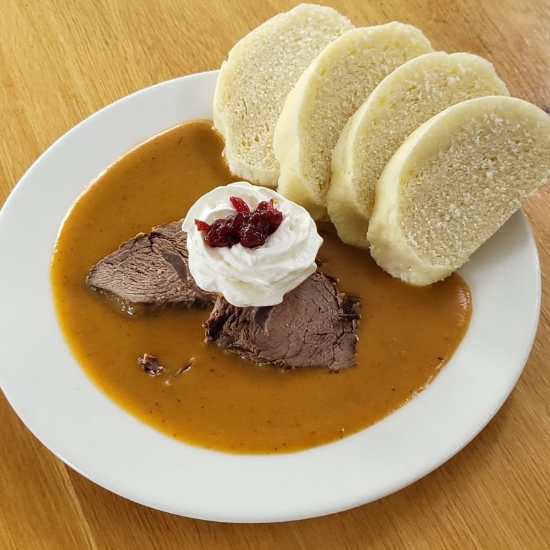 B). 150g Krkonošský hovězí guláš s anglickou slaninou a žampiony, zdobený červenou cibulkou, domácí houskový knedlík