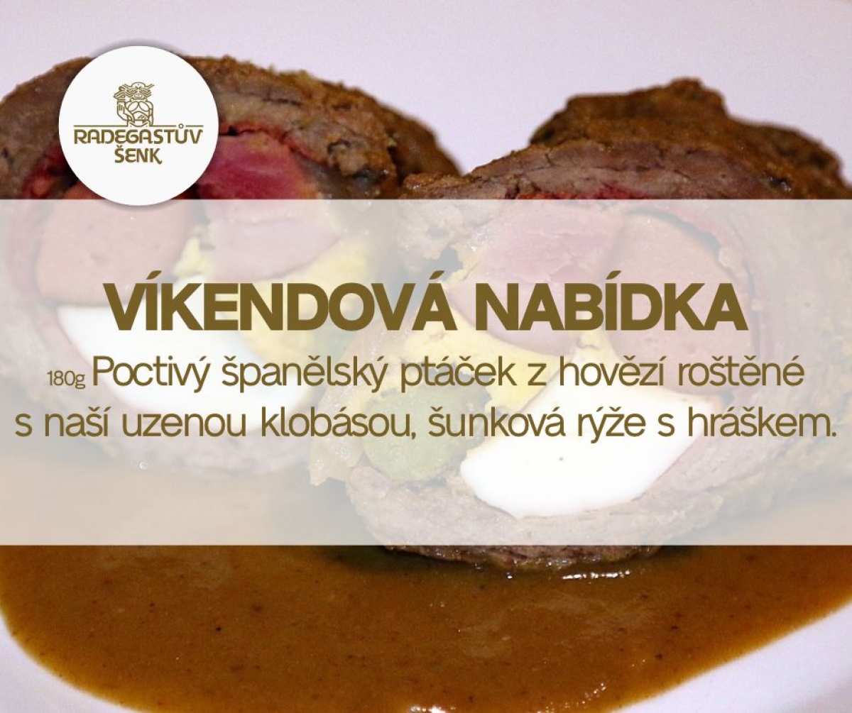 Milí hosté a návštěvníci, štamgasti. Začala nám zima a tak se připravíme na nádherný víkend v #branabeskyd 🤗 A tak vás zveme na TIP! : 180g Poctivý španělský ptáček z hovězí roštěné a naší uzenou klobásou, šunková rýže s hráškem (1,3,9,10), to vše z dílny našeho šéfkuchaře Romana a jeho týmu👨🍳