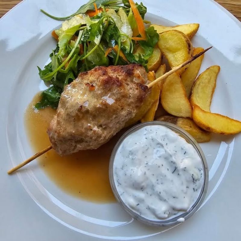250g Bramborové noky s hříbkovou omáčkou a filírovaným kuřecím masem, salátek