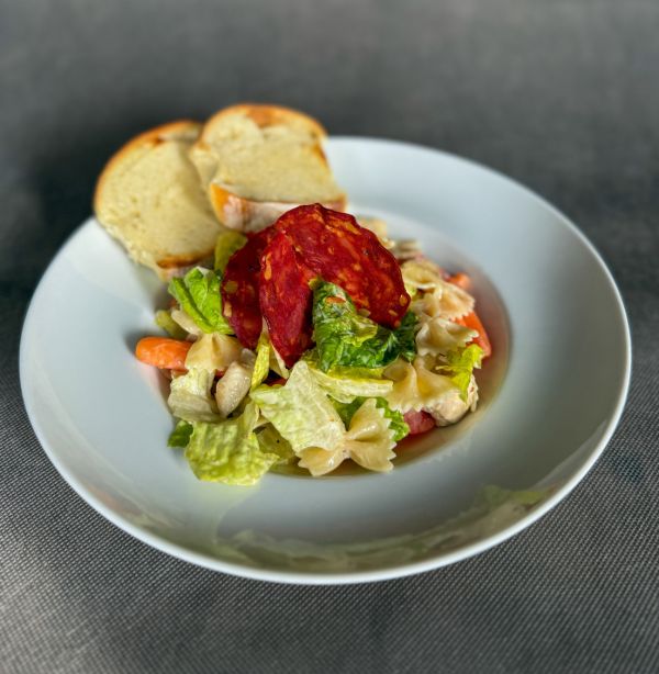 Insalata con carota-římský salát s těstovinami, vařená baby karotka, rajče, restovaný pikantní salám Ventricina, kuřecí maso, medovo-hořčičný dressing...