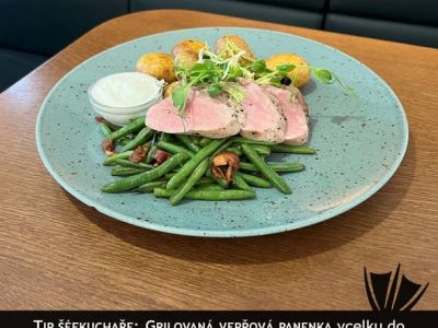 1. 150 g Marinovaný vepřový steak na černém pivě, pečený brambor, pikantní dip (A:1,10,12)