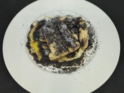 Bramborové knedlíky plněné mákem, přelité povidlovou omáčkou