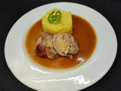 150g Bůčková roláda plněná žemlovou nádivkou, bramborová kaše s cibulkou, okurkový salátek