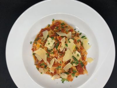 250g Čerstvé nudle tagliatelle di Parma, filírované kuřecí prsíčko, parmskou šunkou, žampiony a smetanou, sypané parmazánem a jarní cibulkou