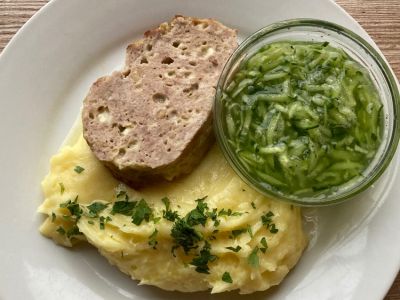 150g Holandský řízek, okurkový salátek, máslová bramborová kaše 137
