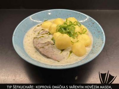 150g vařené hovězí přední, krenova omáčka, houskové knedlíky