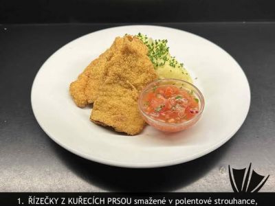 Smažené kuřecí řízečky v parmazánové strouhance, salát Coleslaw, máslová bramborová kaše