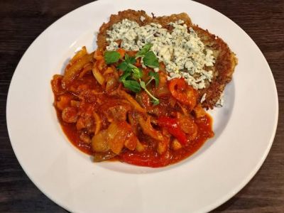 150g Marinovaný steak Argentina s červenou cibulí a klobásou, pečený farmářský cibulový brambor sypaný sýr, salát Colleslaw