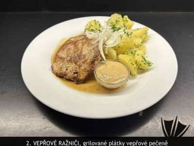 150g veprové žebírko se sunkou a sázeným vejcem, opečené brambory. obloha