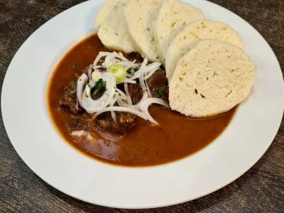 150g vařené hovězí přední, krenova omáčka, houskové knedlíky