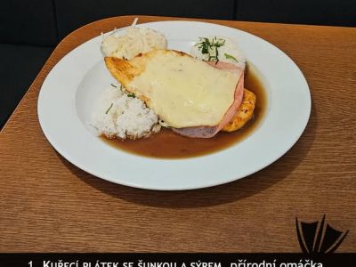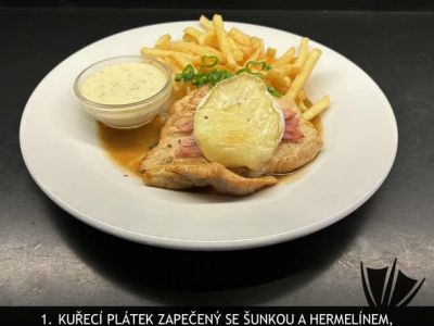 150g kuřecí steak kalifornie, šunka. broskev. eidam. bramborové hranolky. obloha