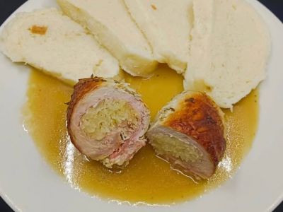 kus Bramborový knedlík plněný uzeným masem, kysané zelí a restovaná cibulka