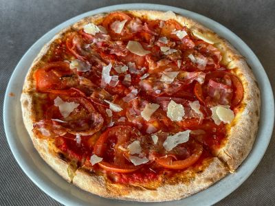 250g Caesar salát s římským salátem, kuřecím filírovaným prsem, slaninou, ančovičkovým dresinkem, krutonky a sýrem Grana Padano