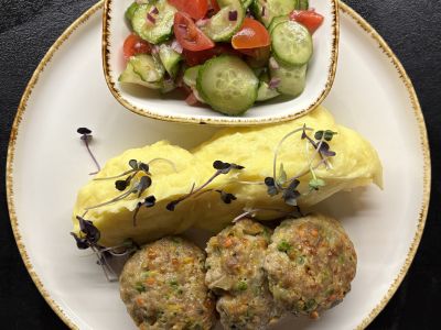 Krůtí řízečky v sezamovém těstíčku, bramborová kaše, ovocný kompot