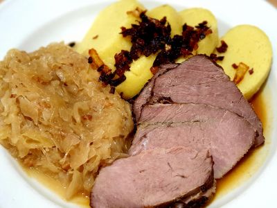 Pomalu pečená vepřová krkovice s červeným zelím a karlovarskými knedlíky