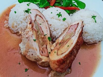 Smažený "Brněnský" vepřový řízek plněný, vařené brambory