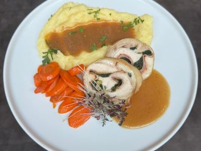 150g Špikovaná vepřová pečeně, špenát, bramborová roláda 1, 3, 7