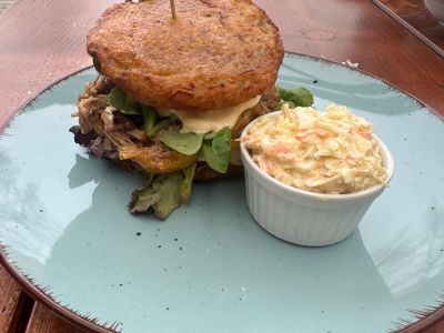 150g KUŘECÍ ŠPÍZ, omáčka z čedaru, americké brambory, salát coleslaw