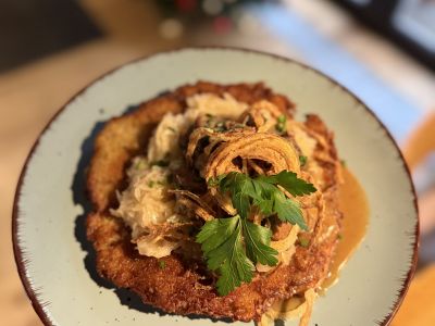 Smažený holandský řízek plněný goudou, bramborová kaše sypaná pažitkou, rajčatový salátek 137