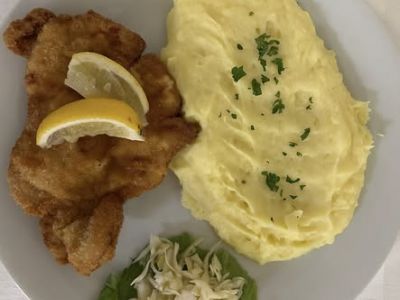 2) 150g Smažený vepřový kotlet, bramborová kaše s restovanou slaninou a sýrem, okurek 137