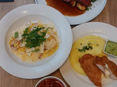 120/250g Bramborové gnocchi v rokfórové omáčce se smetanou, grilované kousky vepřové panenky, rukola, parmezán (1,7,9,10)