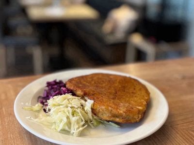 180g SMAŽENÝ KAPUSTOVÝ KARBANÁTEK, šťouchanébrambory, česnekový dip