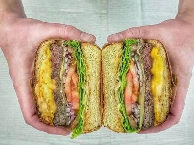 Meat beer burger – v máslové housce zapečený se sýrem raclette, s karamelizovanou cibulí, lanýžovou majonézou, nakládanými okurkami a cibulí