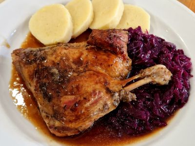 KONFITOVANÁ KACHNA ¼ s červeným zelím a bramborovým knedlíkem s cibulkou