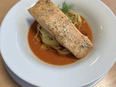 INSALATA DI SALMONE směs listových salátů, grilovaný losos, olivy, rajčata, pomeranč, kapary, česnekový dresink