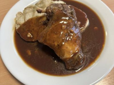 Menu + Polévka: Vepřový špalíček pečený na kmíně, červené zelí, bramborové knedlíky