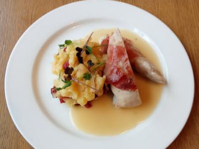150g Pečená vepřová kapsa s anglickou slaninou a hermelínem, hranolky