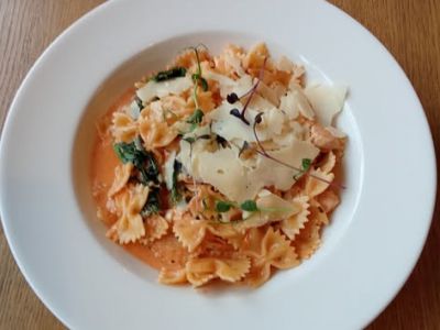 Penne s pancettou, artyčoky, baby špenát, krémová omáčka, sýr Grana Padano