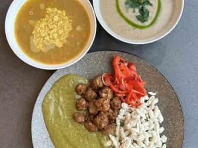 Celozrnná rýže, zeleninová směs s květákem a dýní v jemně pikantní omáčce z červené čočky s kokosovým mlékem a kajenským pepřem, salátový mix se sumahem a bio olivovým olejem